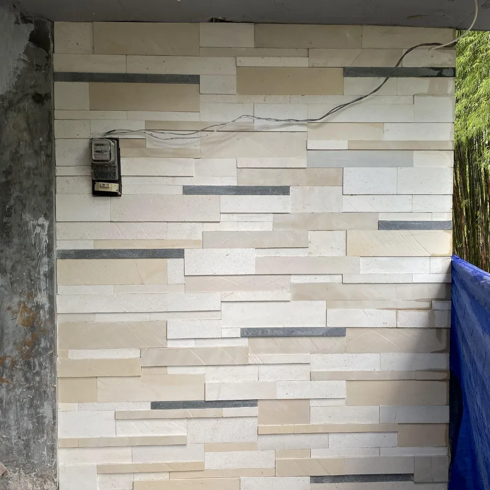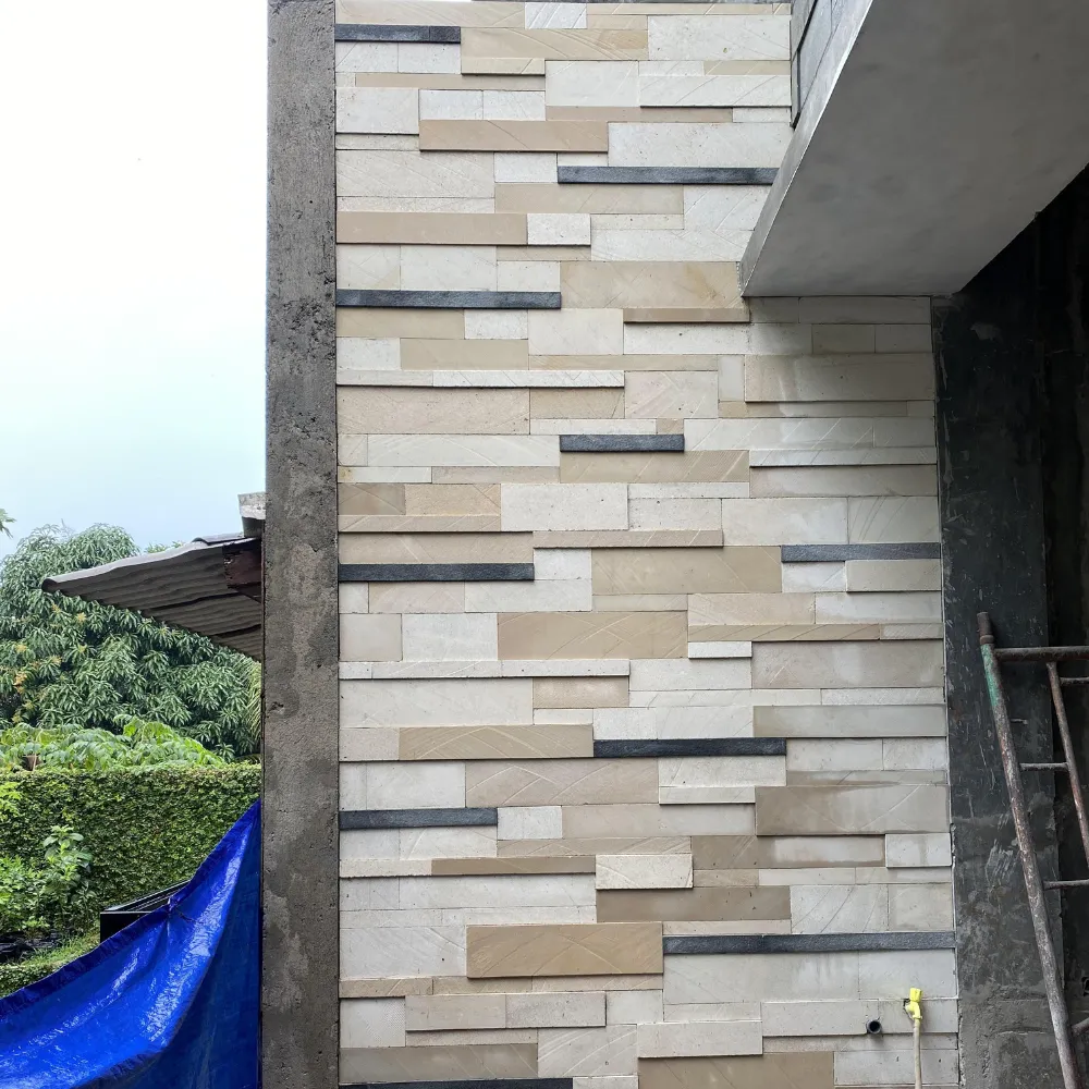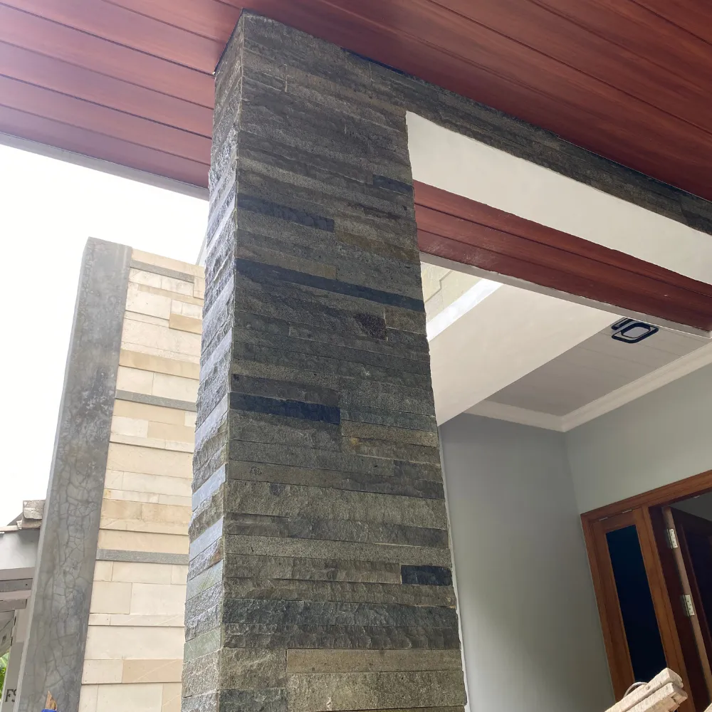 Kombinasi batu paras dan batu andesit susun sirih menghadirkan harmoni antara keindahan alami dan kekuatan eksterior rumah. Wujudkan desain rumah impian Anda bersama Mughnistone, spesialis pemasangan batu alam untuk proyek hunian eksklusif.