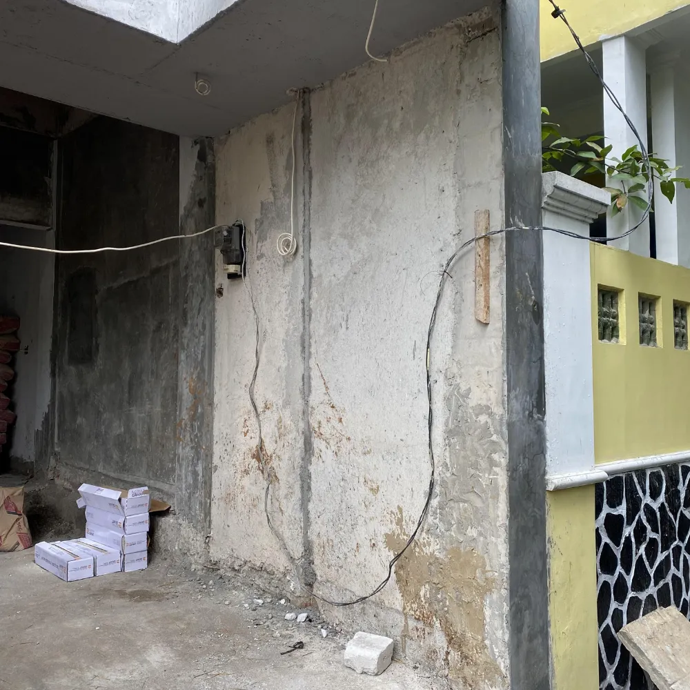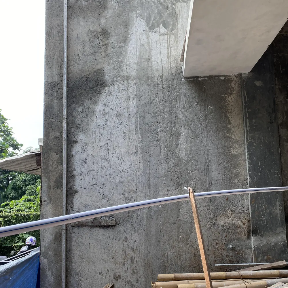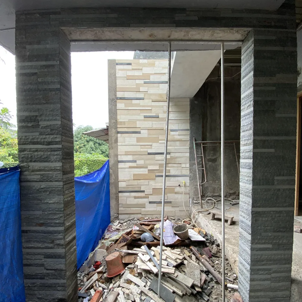Batu paras kombinasi dipasang pada dua sisi dinding carport: sisi kiri sebagai dinding utama carport, sementara sisi kanan lebih tinggi hingga lantai dua yang kemungkinan akan dipadukan dengan taman hias. Untuk menambah aksen kokoh dan berkelas, batu andesit susun sirih diaplikasikan pada pilar-pilar rumah, sehingga menciptakan fasad yang harmonis dan modern.