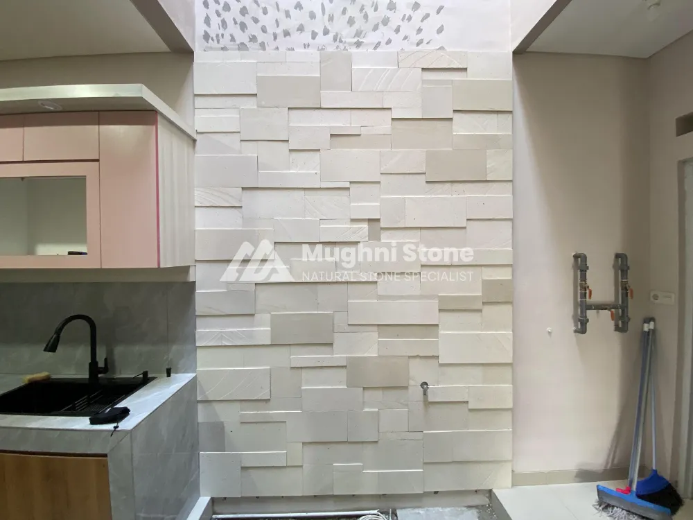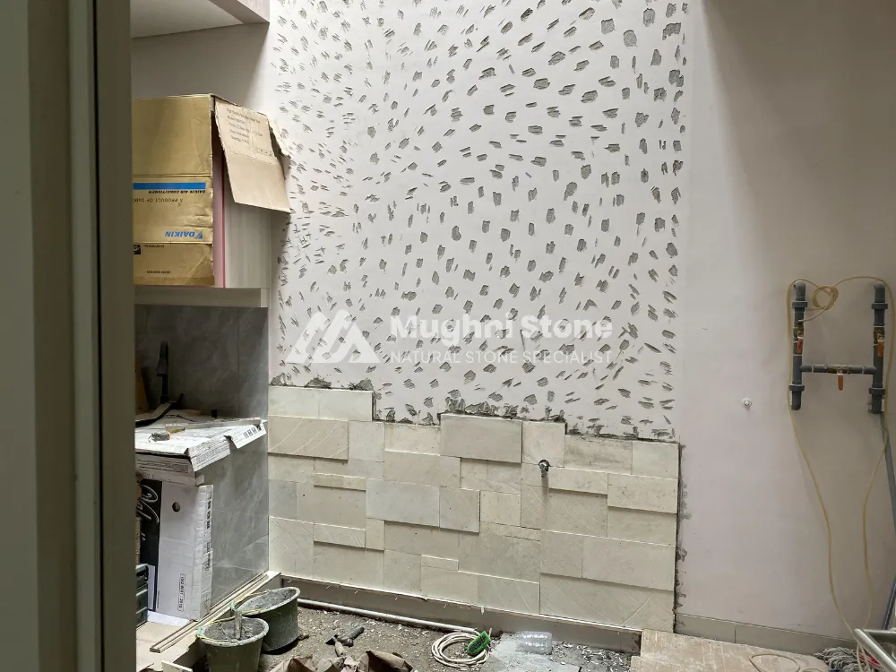 Batu paras putih menjadi salah satu material favorit untuk interior maupun eksterior karena kesan cerah, bersih, dan sejuk yang diberikannya. Dalam proyek di Ayodha Cikokol, Tangerang, Mughnistone dipercaya untuk memasang batu paras putih kombinasi pada dinding area void.